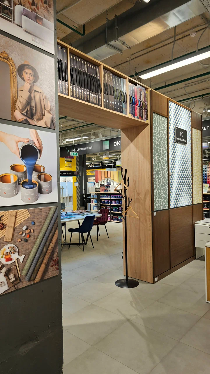 Помимо обоев там можно приобрести клей,плинтус, декоративные панели. Так же магазин предоставляет услуги по колеровке.
