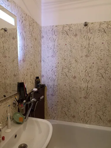 Замечательные обои! Очень милый нежный рисунок, тактильно приятная текстура. Плотные, но "эластичные", хорошо прилегают. У нас в ванной очень неровные стены (не хочется ровнять под плитку, вот и используем обои). Первый раз клеила обои, для которых клей надо наносить на стену - это, оказывается, намного удобнее, чем с клеем на обоях. Поскольку обои не супервлагоустойчивые использовали защитную плёнку в мокрой зоне.
