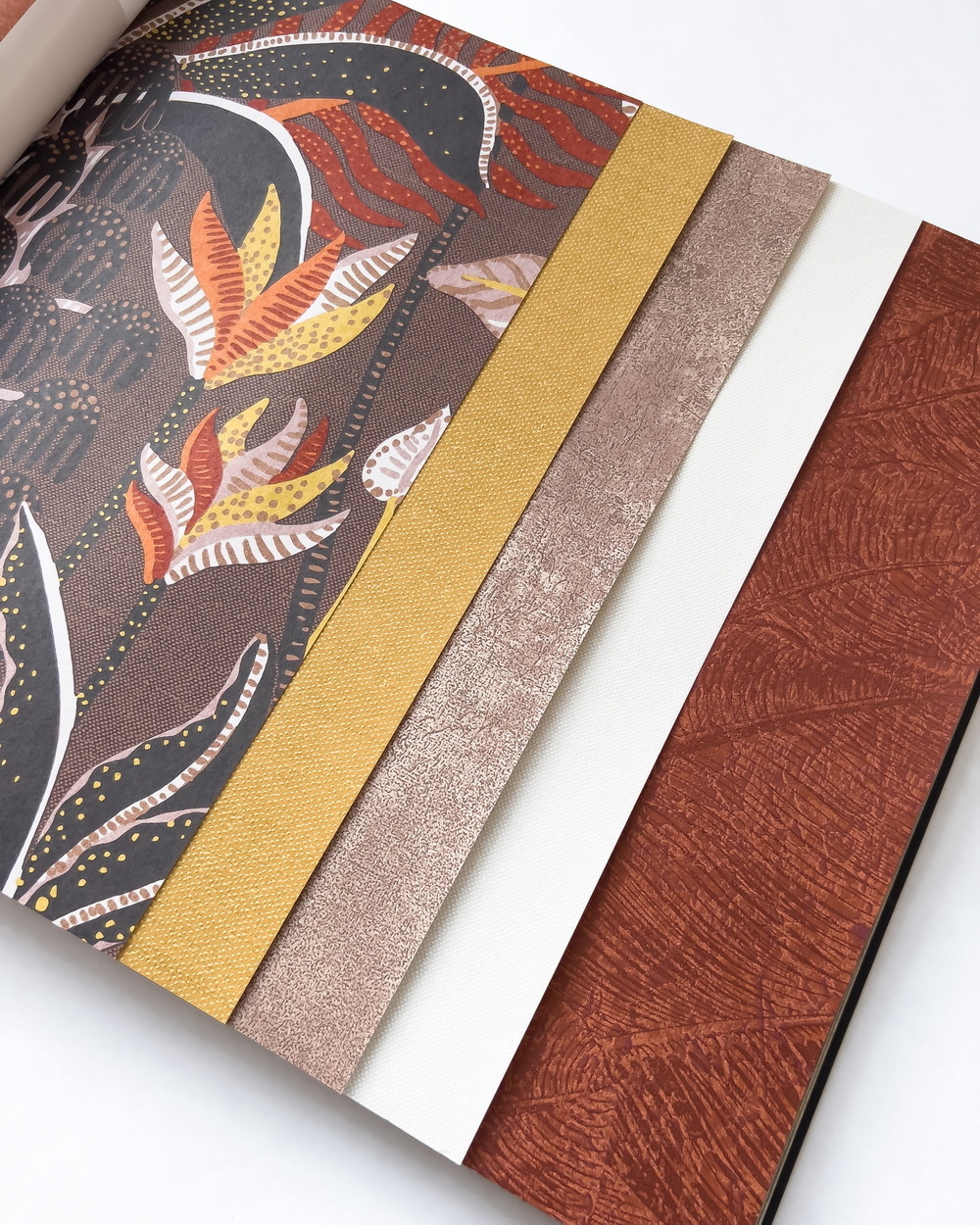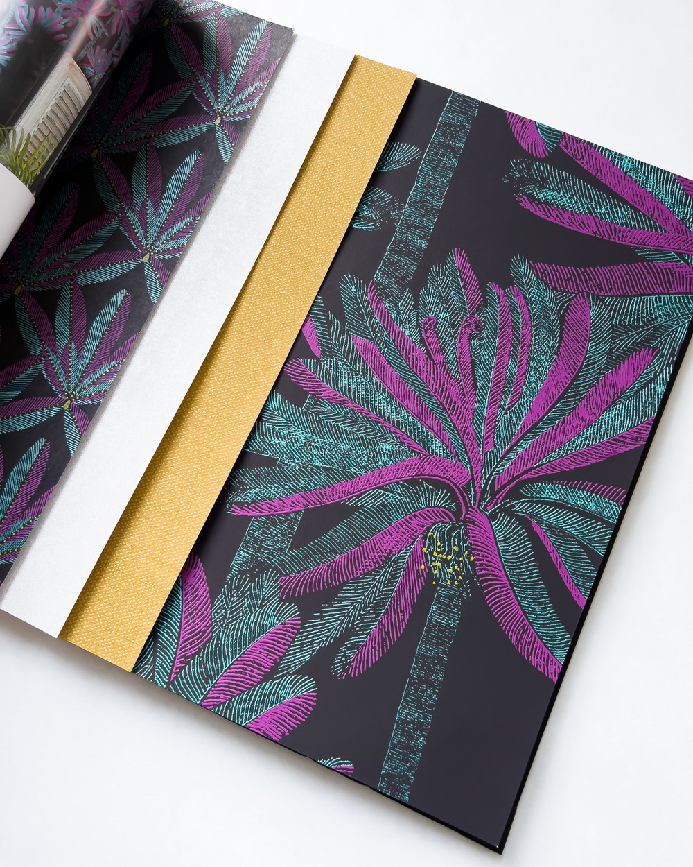 Havana — прочтение темы джунглей в интерьере от бренда Khroma. Это настоящий взрыв цвета: в обоях сочетаются насыщенный фуксийный, черничный, ультрамарин и зеленый. Тропики здесь предстают в разных ипостасях: игривые и декоративные изображения деревьев, экспрессивные листья и цветы, геометрический узор из миниатюрных пальмовых листочков.