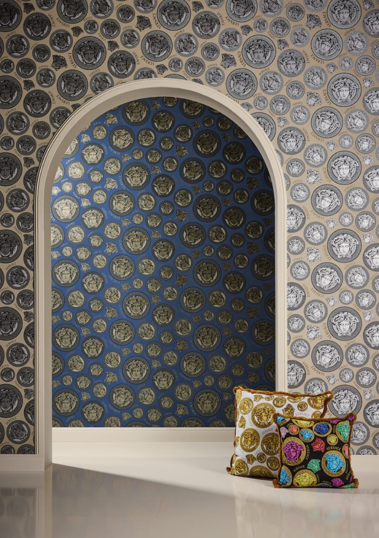 Великолепный набивной рисунок, много золота и дорогие материалы — это фирменный знак Versace, такой же, как и уже почти ставшие символом классики декоры Greek Key и Barocco.