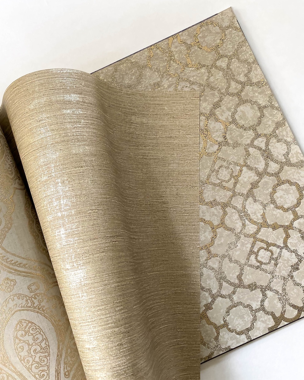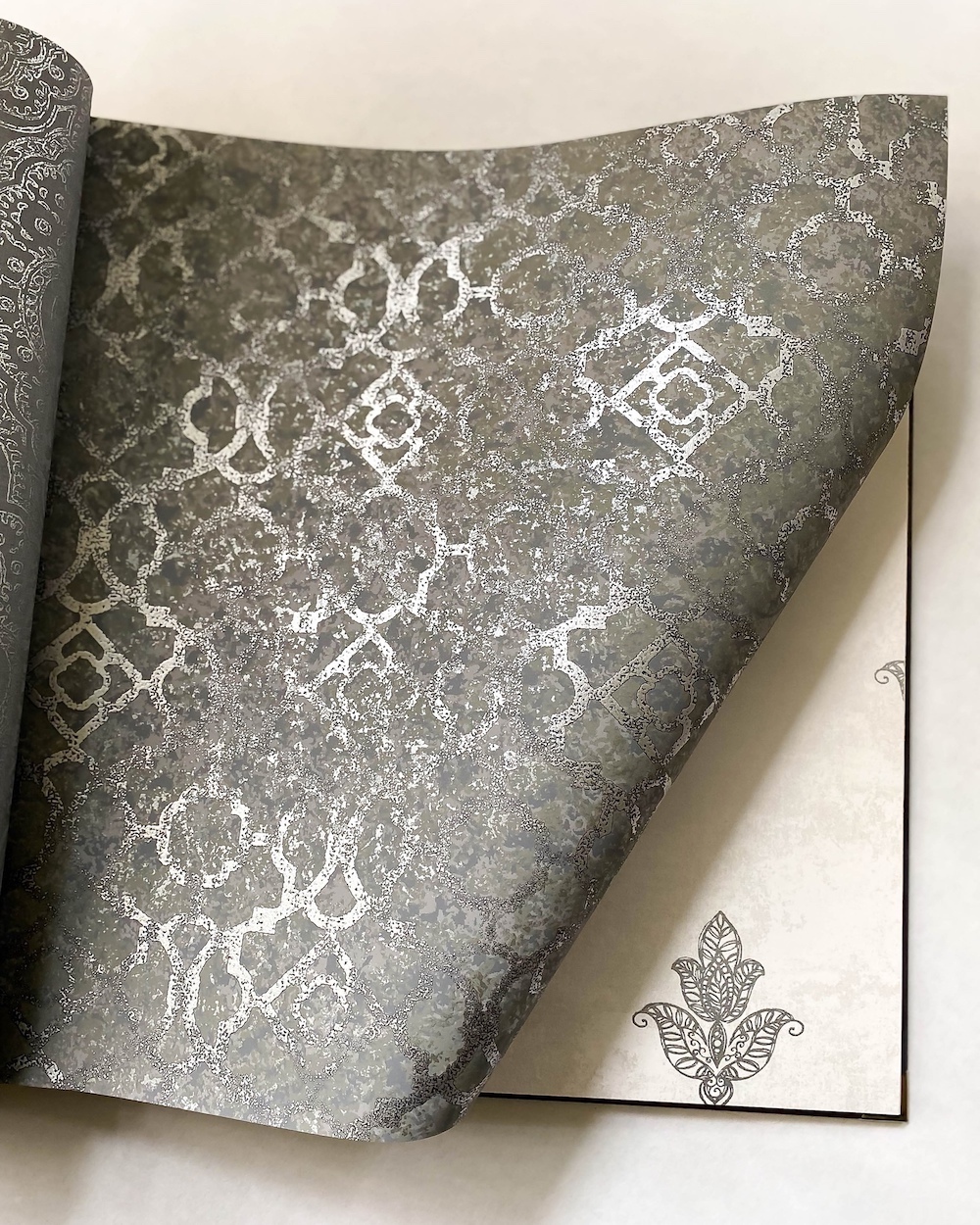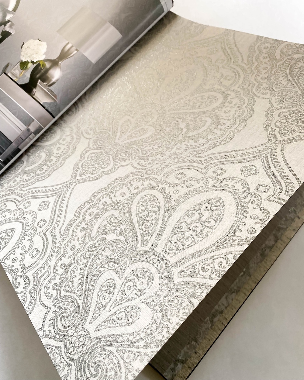 Emporium — изящный каталог от канадского бренда Aura. Коллекция выполнена в восточном стиле и являет нам матовые и перламутровые фактуры с точёными металлизированными орнаментами. Здесь и любимый нами «четырехлистник», и миниатюрные «королевские лилии», и ажурный «дамаск». Благодаря металлическим эффектам, обои красиво мерцают на свету.