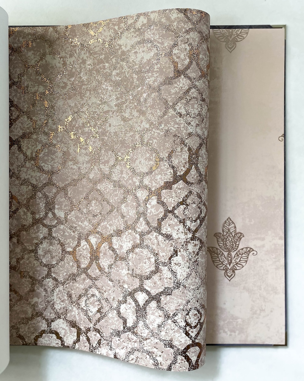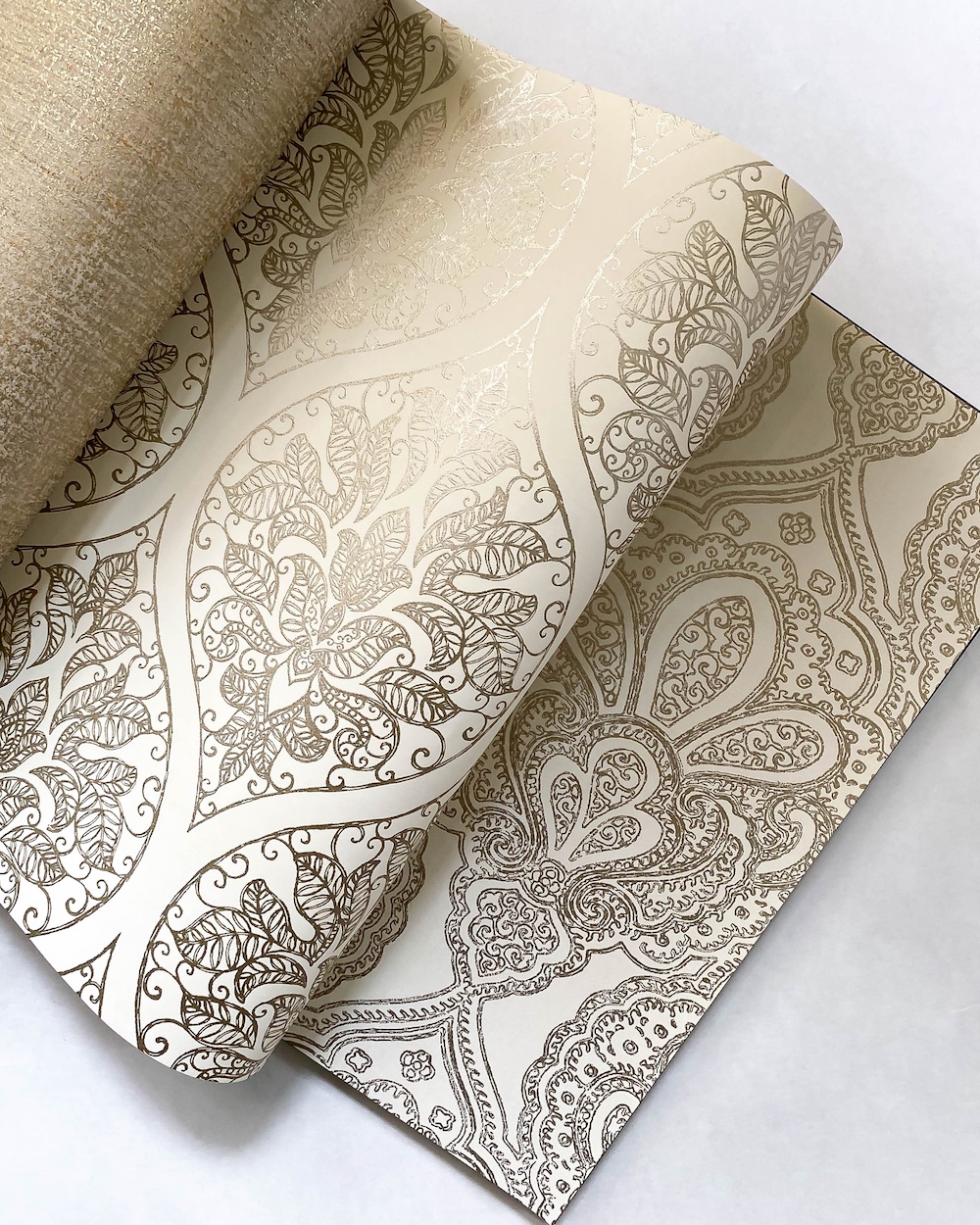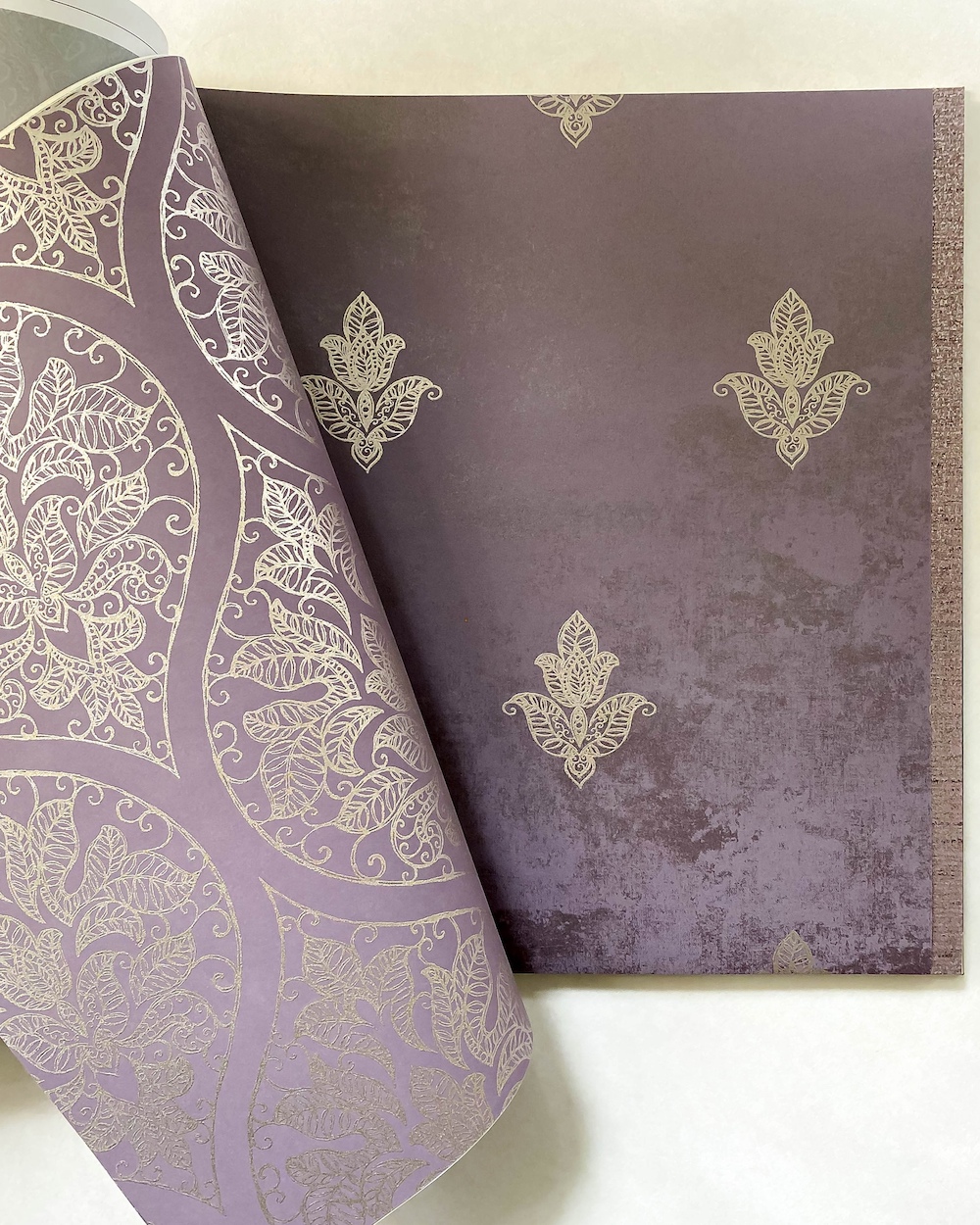 Emporium — изящный каталог от канадского бренда Aura. Коллекция выполнена в восточном стиле и являет нам матовые и перламутровые фактуры с точёными металлизированными орнаментами. Здесь и любимый нами «четырехлистник», и миниатюрные «королевские лилии», и ажурный «дамаск». Благодаря металлическим эффектам, обои красиво мерцают на свету.