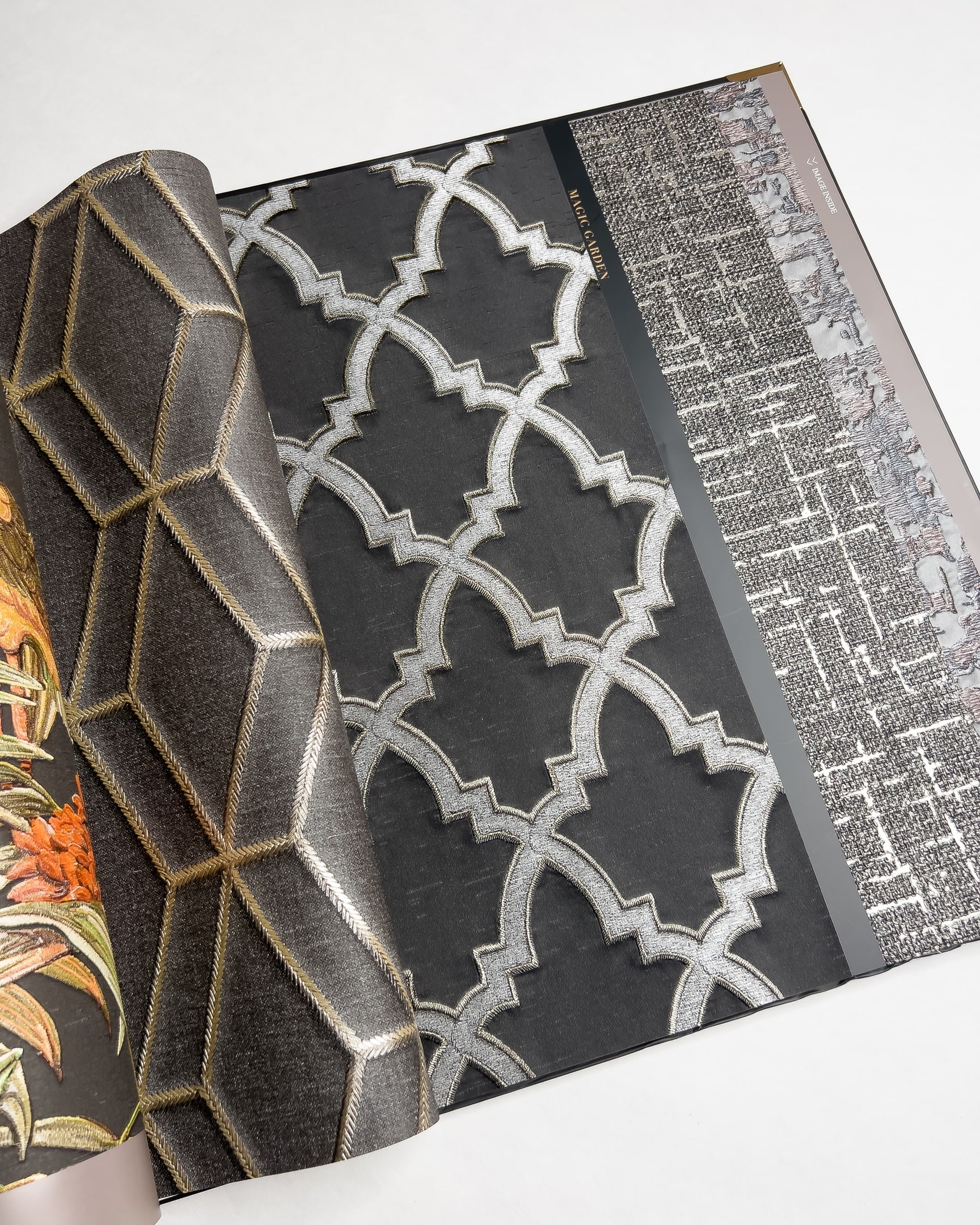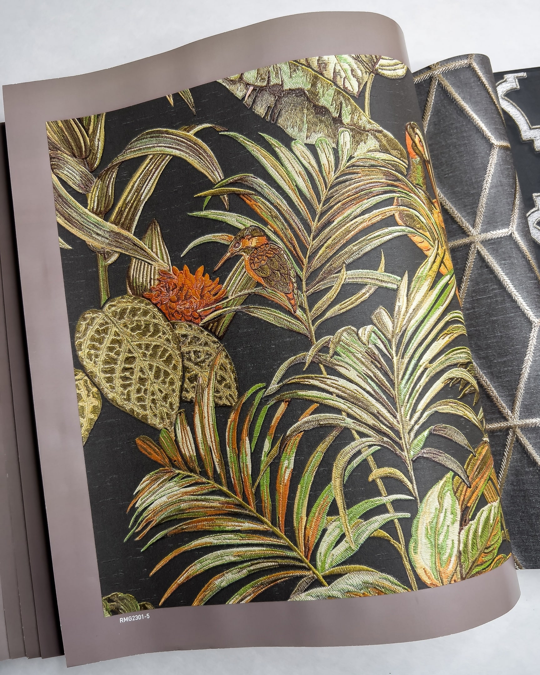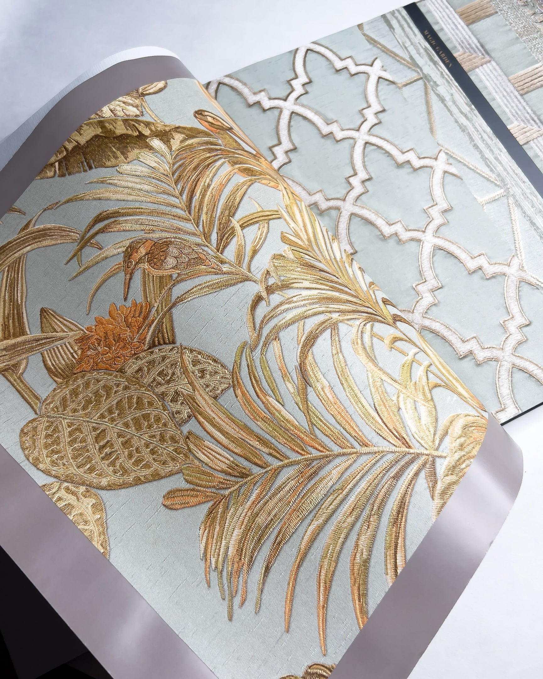Коллекция от бренда Solo с эффектом вышивки. Основа выглядит как атласное или шелковое полотно на котором «вышиты» ромбы, рисунок «решетка», серебристые нити или многоцветные птицы в окружении растений. Каталог представляет собой визуальное отражение роскошного сада, где есть и изящные ограды, и богатая растительность.