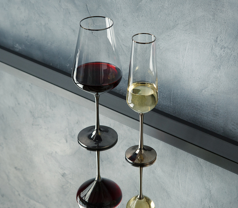 Обратите внимание, что ножки фужеров выкрашены в платиновый цвет. Мы постарались создать универсальную коллекцию, которая будет уместна при классической сервировке стола, а также стильным аксессуаром в современной сервировке с использованием на столе металла, камня, дерева или грубой ткани.
