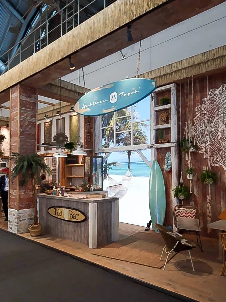 Обойные фабрики стараются креативно декорировать стенды и представить самые интересные новинки. Особенно порадовал бренд Architects Paper, который оформил свою площадку в виде бара для серфингистов.
