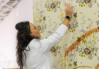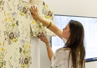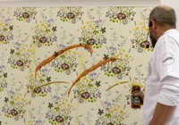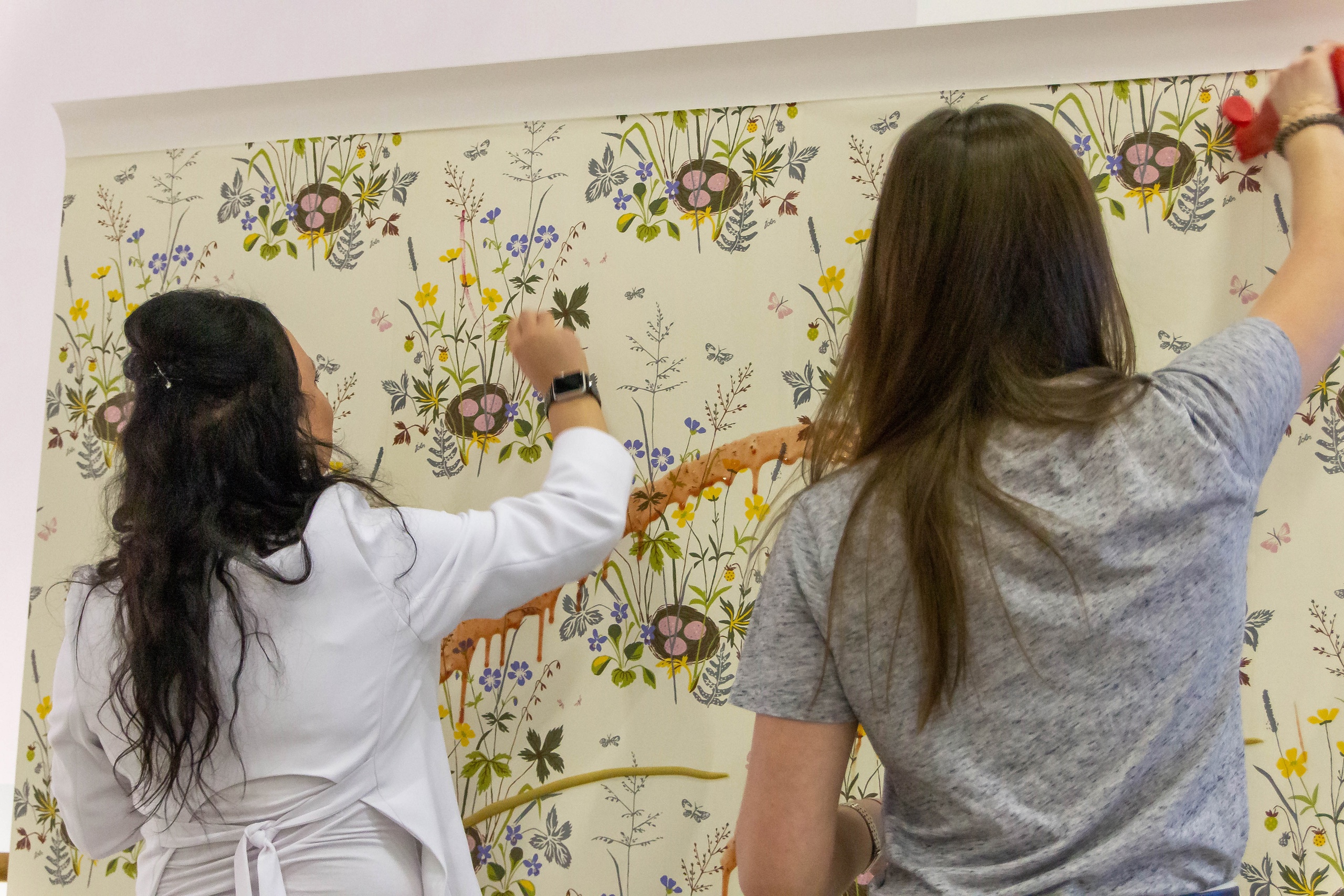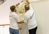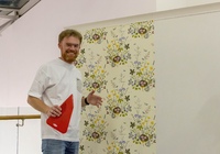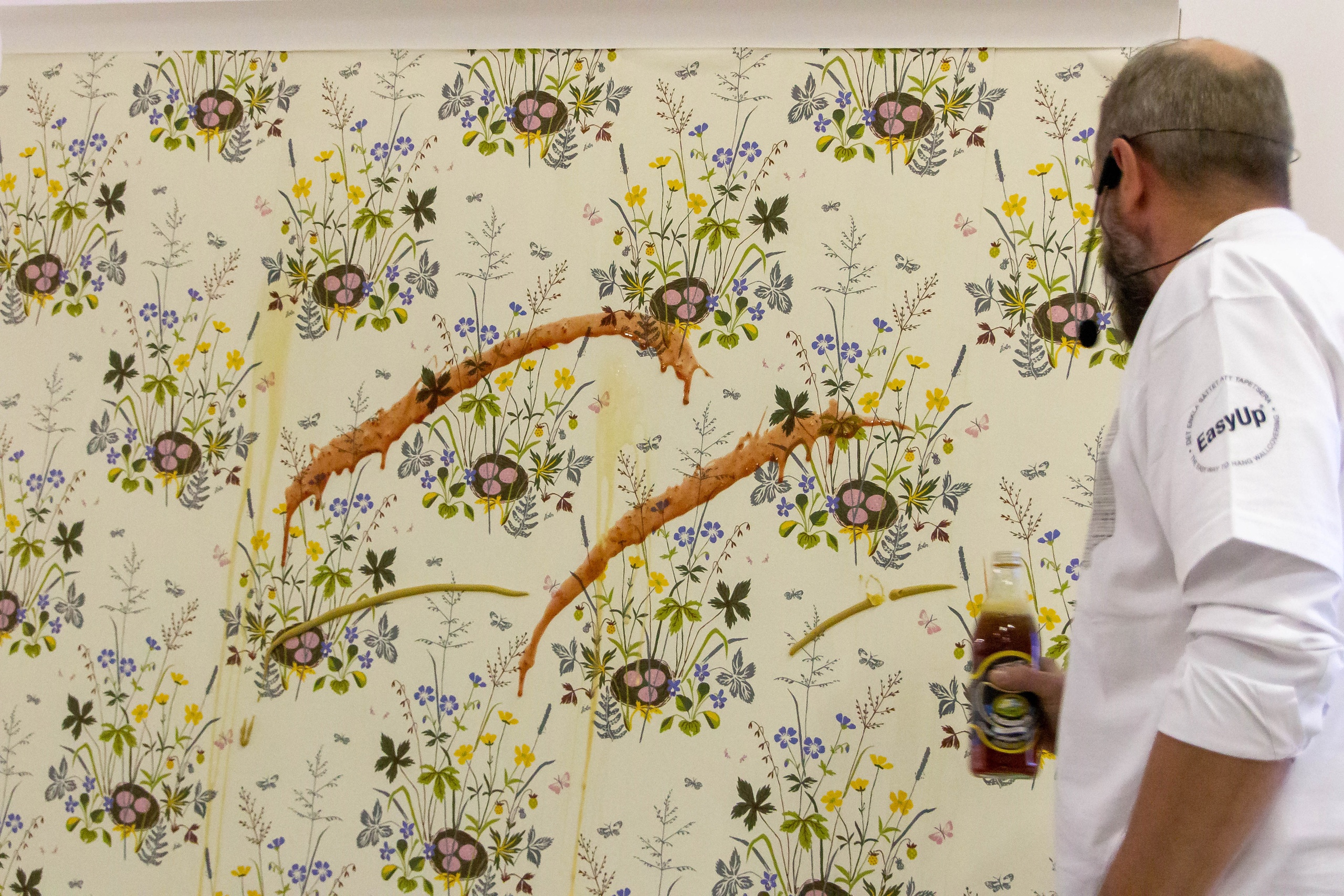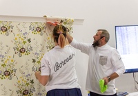 После небольшой лекции, директор ODesign давал мастер-класс по монтажу обоев Borastapeter из новой коллекции. Итак, мы научились клеить обои, пора попытаться испортить их! Свеженаклеенные полотна были испачканы помадой, кофе и кетчупом. Загрязнения легко удалились влажной мягкой губкой, а главное рисунок остается в первозданном виде.
