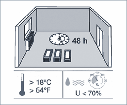 Ламинат нельзя использовать в местах прямого контакта с водой и в помещениях с повышенной влажностью. Перед укладкой требуется обеспечить хранение ламината в горизонтальном положении, в упаковке, в течение 48 часов при комнатной температуре (не менее +18°С) и влажности воздуха не более 70%. Упаковку (плёнку) вскрывать непосредственно перед укладкой. После укладки необходимо проветрить помещение.