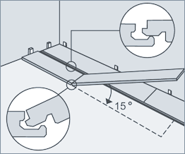 Необходимо соблюдать монтажные деформационные зазоры: не менее 10 мм от края покрытия до стен. Укладка ламината начинается с формирования первого ряда. Панели соединяются по торцевым замкам под углом 15 градусов.