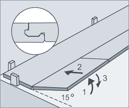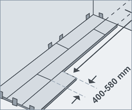 Обратите внимание: элементы следующего ряда соединяются по поперечной стороне, и после этого соединяются по продольной стороне с предыдущим рядом. Рекомендуемое смещение элементов пола в соседних рядах относительно друг друга - от 400 до 580 мм.