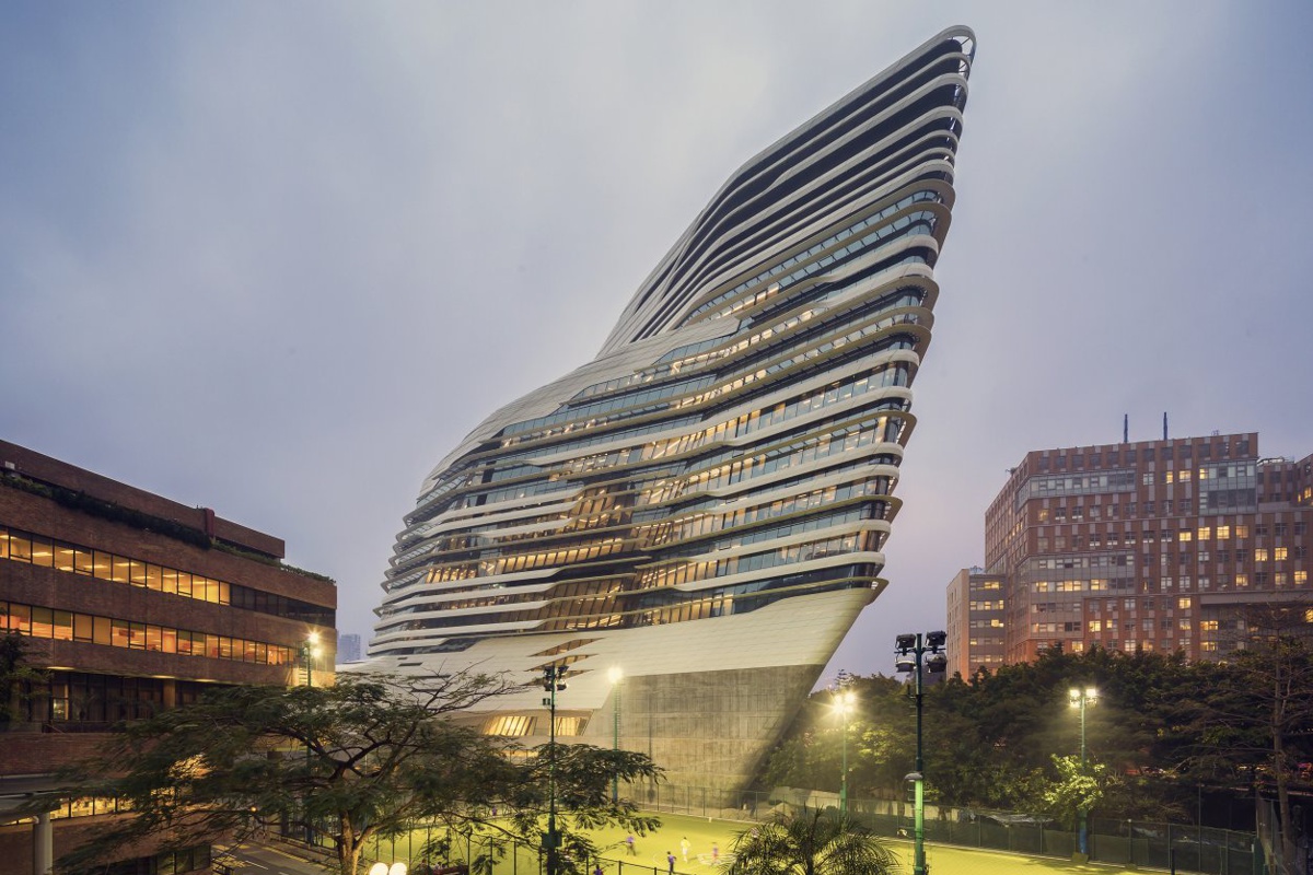 Башня инноваций в Гонконге напоминает причудливую раковину или срез горных пород. Визуально здание состоит из горизонтальных плоскостей и органично вписывается в городскую среду. Панно с орнаментом из стремительных линий разрушает границы скучных бетонных коробок и сглаживает острые углы.